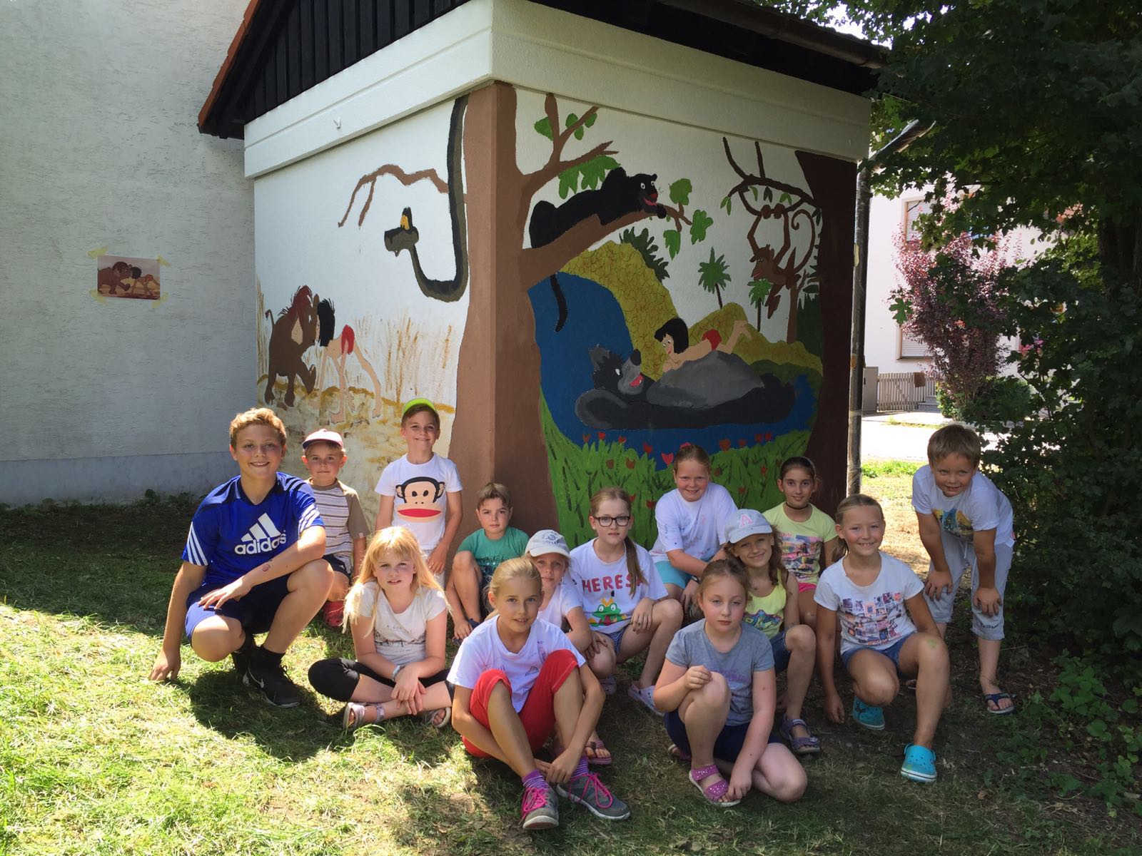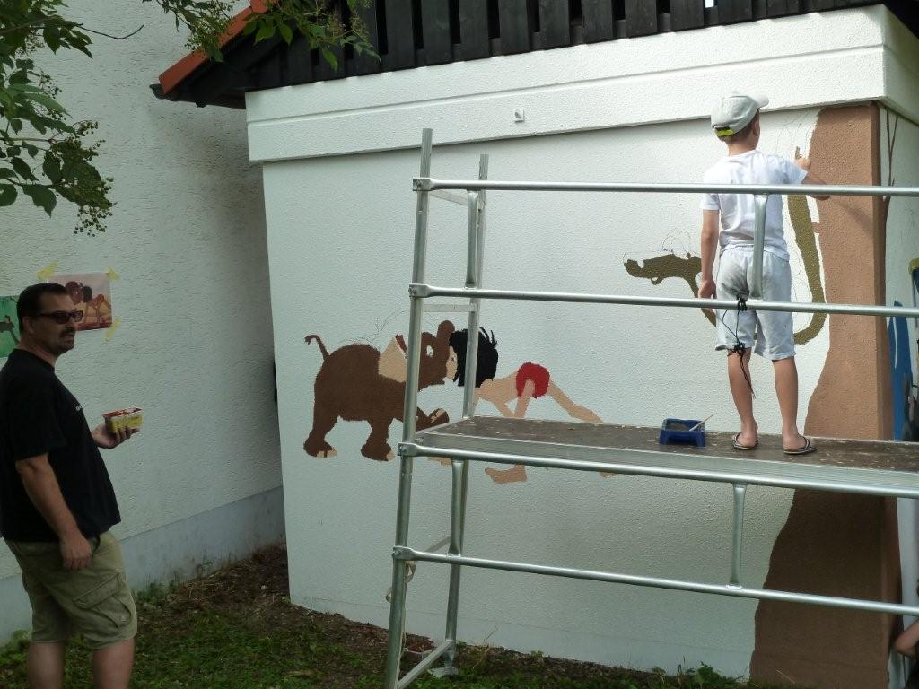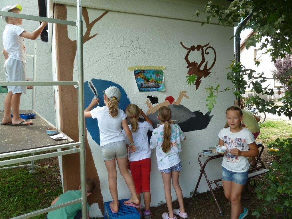 Nun konnten die Kinder mit dem Malen beginnen. Die Künstler waren wieder konzentriert und eifrig bei der Sache und die Figuren aus dem Dschungelbuch wurden lebendig. Mit der Zeit wurde es sehr heiß und die Kinder konnten sich zwischendurch mit Getränken und Brotzeit stärken. Bis zum Schluss arbeiteten die kleinen Maler akribisch an den Kunstwerken. Das Fazit zum Schluss: „Es schaut einfach toll aus!“