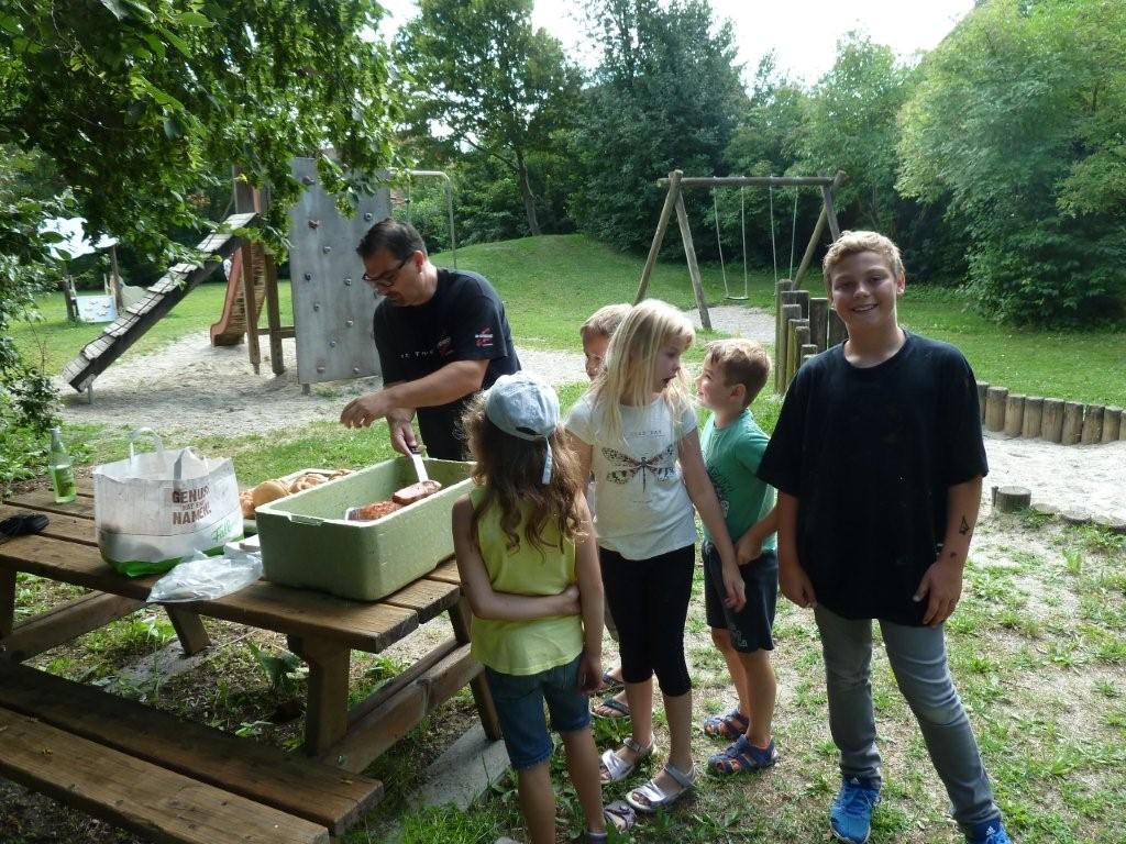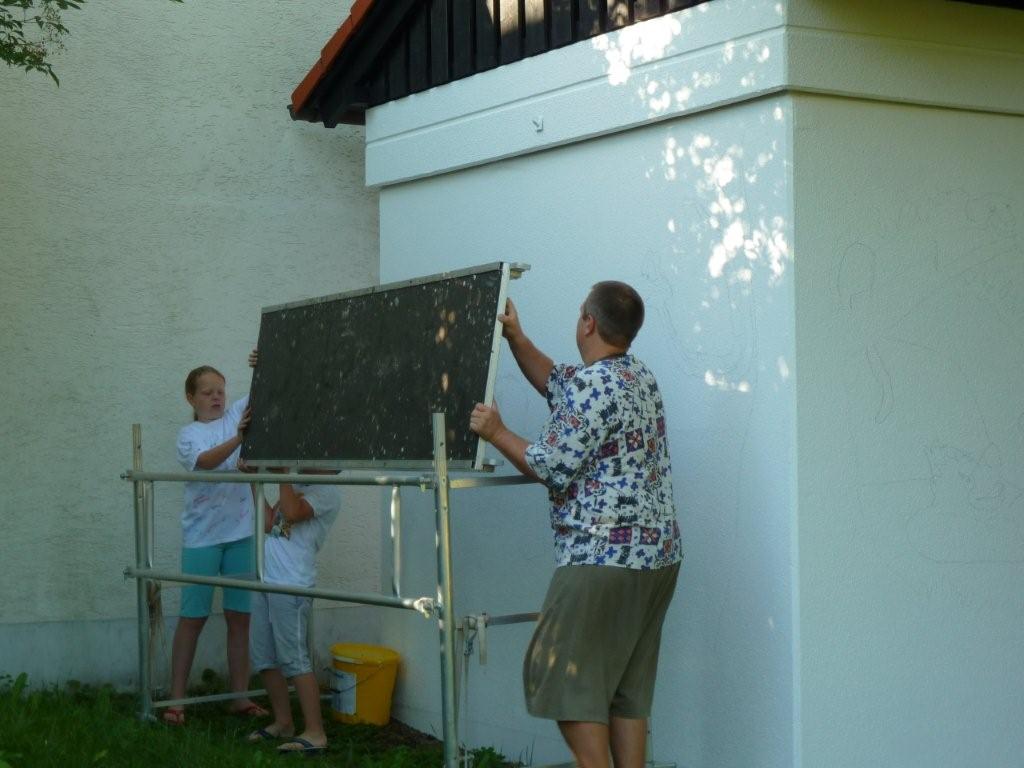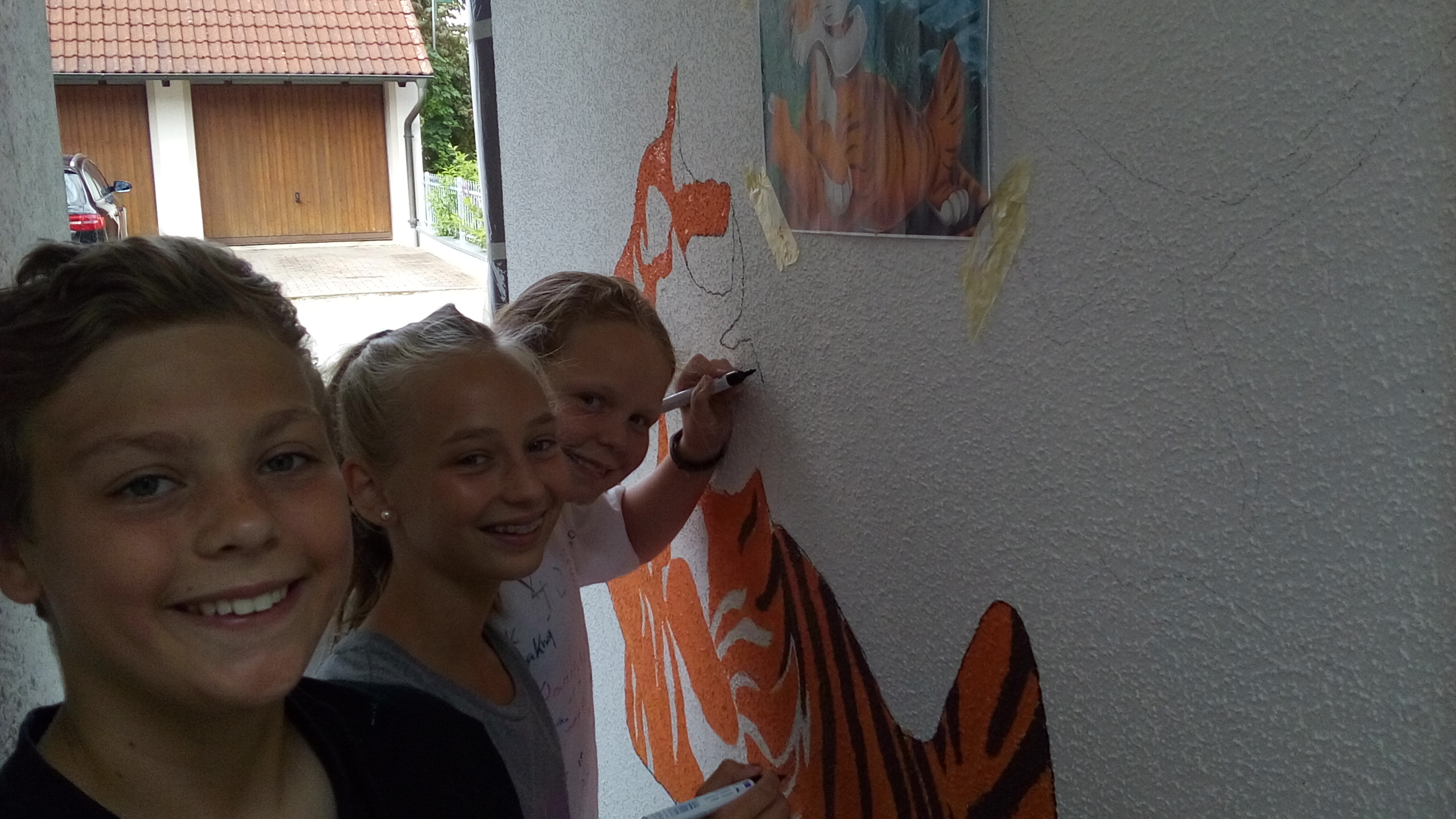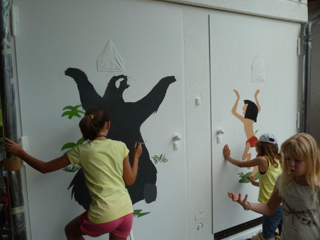 Nun konnten die Kinder mit dem Malen beginnen. Die Künstler waren wieder konzentriert und eifrig bei der Sache und die Figuren aus dem Dschungelbuch wurden lebendig. Mit der Zeit wurde es sehr heiß und die Kinder konnten sich zwischendurch mit Getränken und Brotzeit stärken. Bis zum Schluss arbeiteten die kleinen Maler akribisch an den Kunstwerken. Das Fazit zum Schluss: „Es schaut einfach toll aus!“