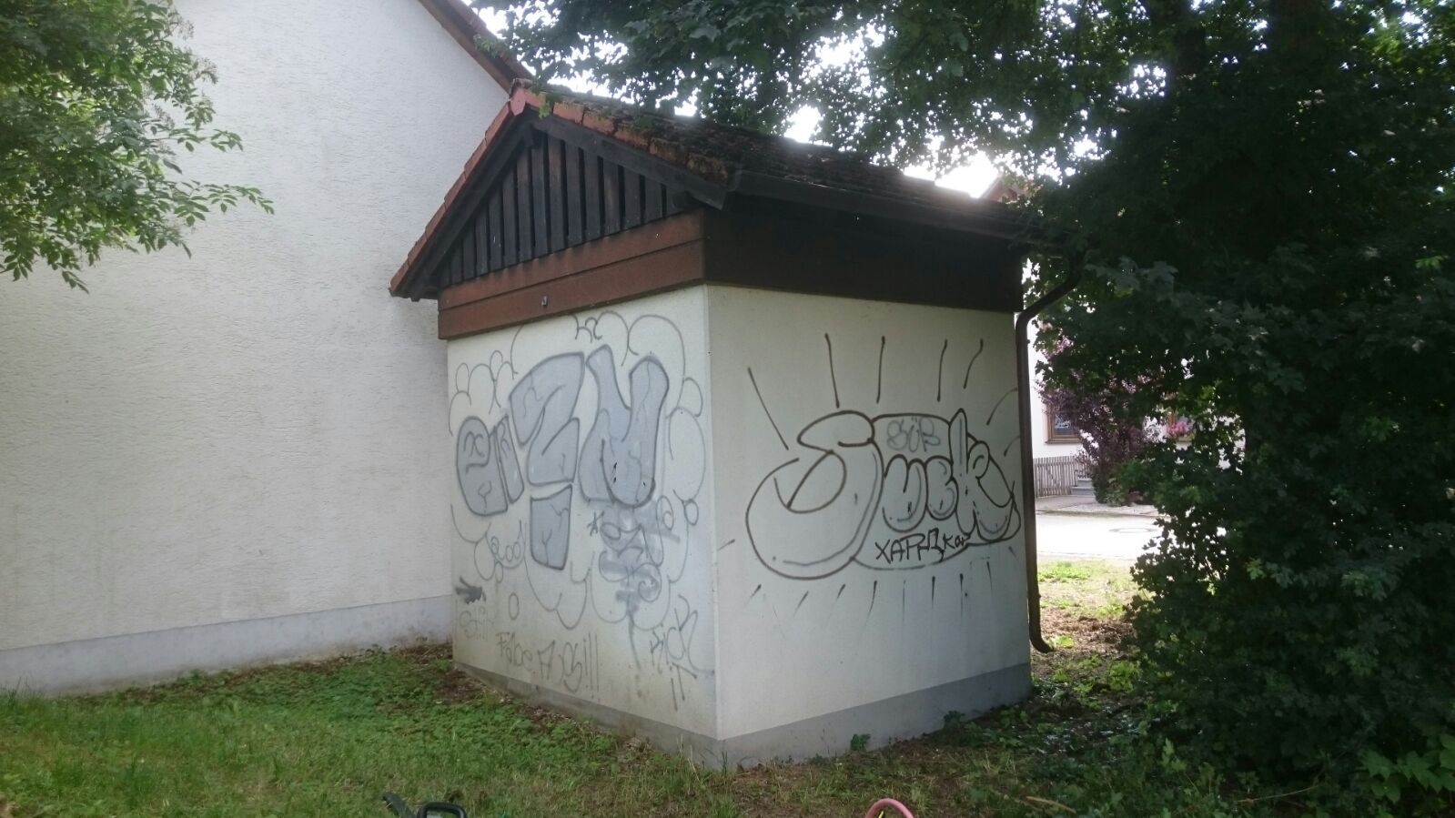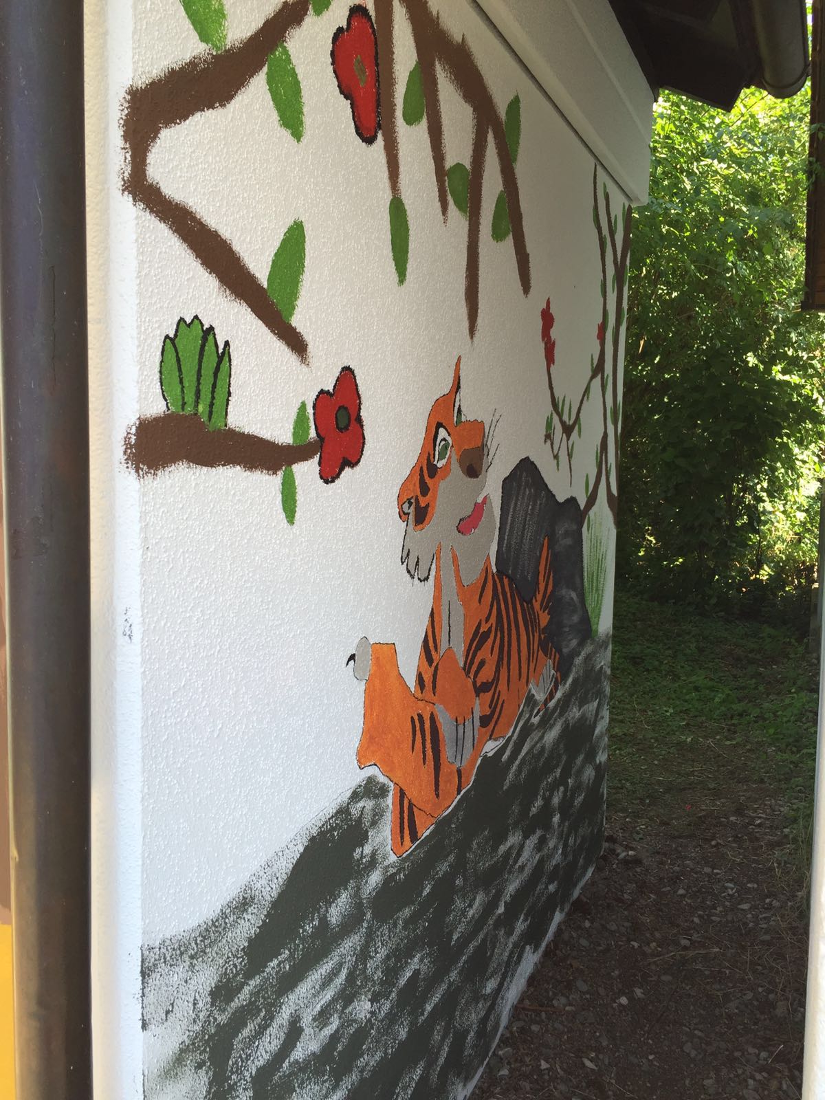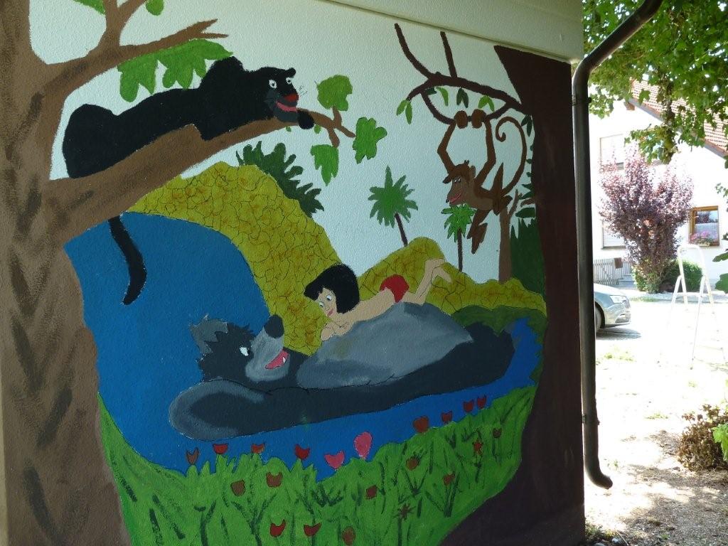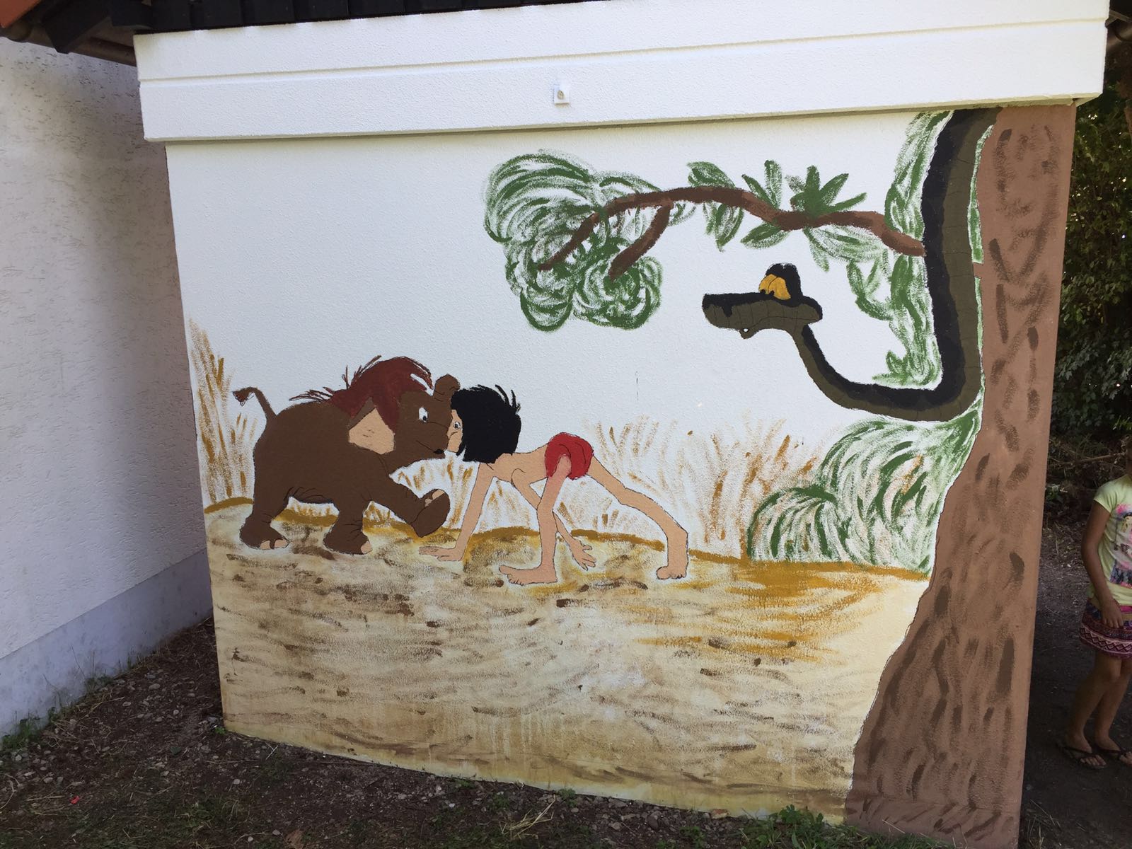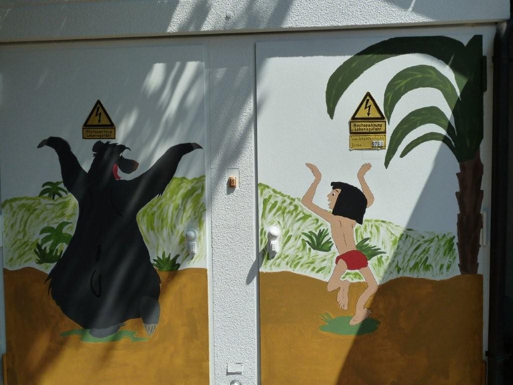 Bei der Ferienpassaktion 2016 der Compakt – Liste Karlskron (CLK) haben die teilnehmenden Kinder das Trafohäuschen am Spielplatz in Mändlfeld gestaltet. Sie bemalten es mit Motiven aus dem Zeichentrickfilm „Das Dschungelbuch“. Jetzt schmücken Mowgli, Balu und Co das Häuschen in der Florianstraße.