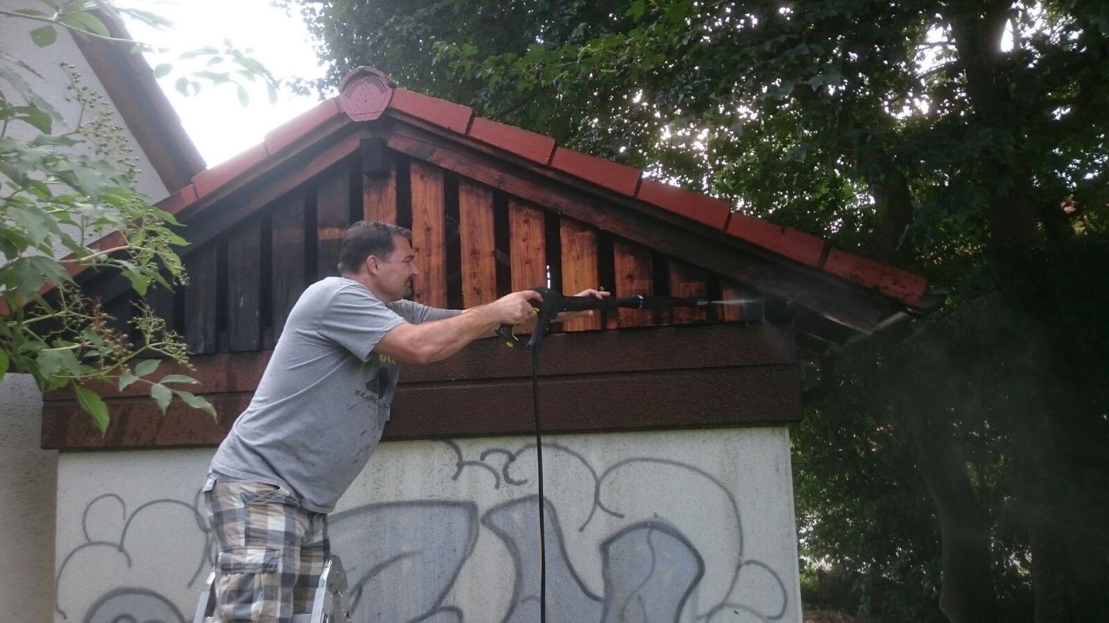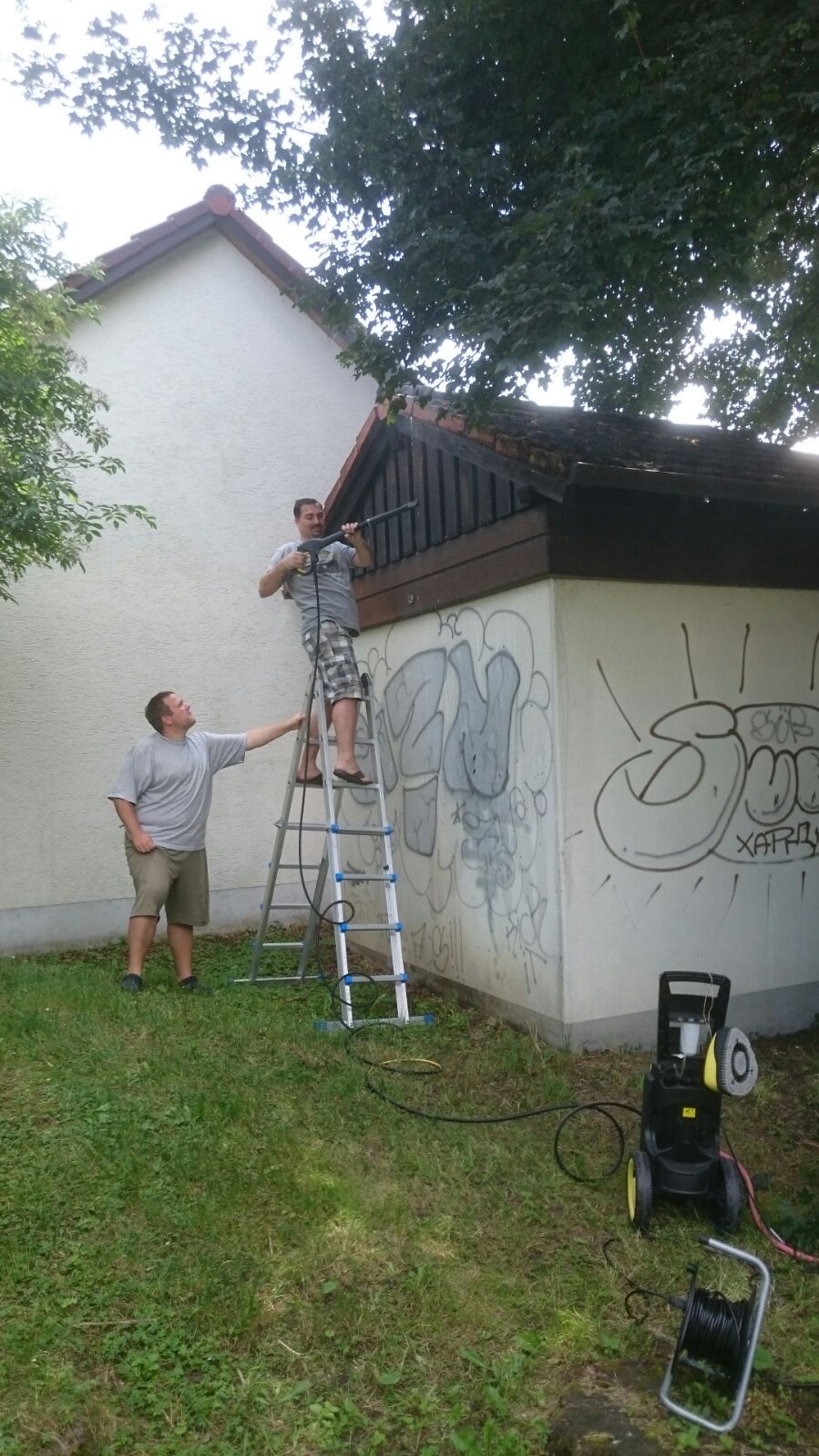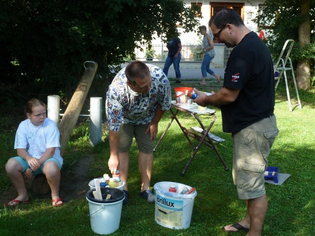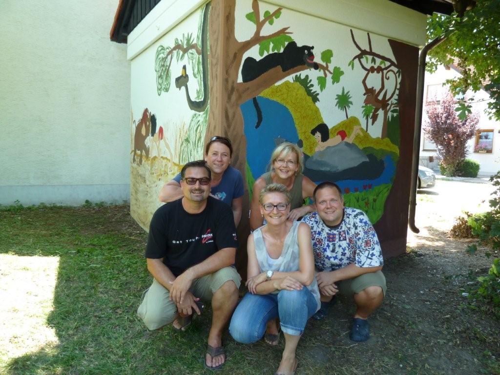 Im Vorfeld hatten die CLK viele Dinge zu organisieren, gefolgt von viel Arbeit: Mit der Erlaubnis und finanzieller Unterstützung der Bayernwerke konnten die Vorbereitungen am Trafohäuschen beginnen. Zuerst mussten die CLK-Helfer das Strauchwerk ausschneiden und den Schmutz am Häuschen mit dem Dampfstrahler entfernen. Bei den Malerarbeiten war wieder Rudi Gebhart eine große Hilfe, der beratend und auch tatkräftig zur Seite stand. Das Mauerwerk musste grundiert und weiß gestrichen werden, die Türen benötigten mehrmals einen Anstrich. Auch das Holz am Dach wurde eingelassen. Schließlich erstrahlte das vorbereitete Häuschen in neuem Glanz. Nach dem Vorzeichnen der Konturen für Mowgli, Balu, Kaa, Junior und Shere Kan waren die Vorarbeiten fertig.